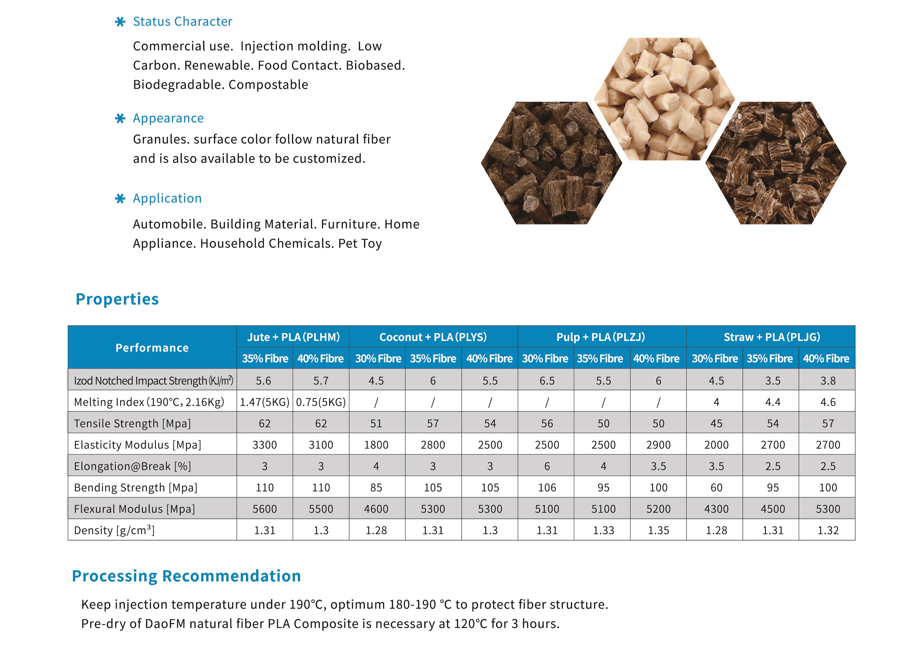 云鼎DaoFM PLA系列产品,是一款创新性天然纤维复合材料;由30-50%的天然纤维生产制作,比如椰丝,黄麻,木浆,与PLA混炼、造粒而成;该项技术属于云鼎专有技术。纤维来源于可再生安全渠道。云鼎DaoFM PP系列复合材料能够100%回收且全降解。